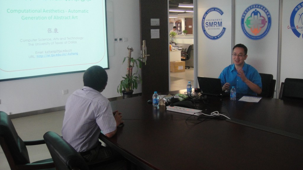 德克萨斯大学张康教授来访本实验室 2015年6月29日 分子影像重点实验室 2015年6月29日,院创新国际团队海外专家张康教授应邀访问实验室,将与师生一起进行学术交流。张康教授是美国德克萨斯大学教授,国家千人计划入选者,在计算机图形图像领域有很高的造诣,有很宽广的学术视野,与张教授近距离的学术交流给大家带来不少收获。