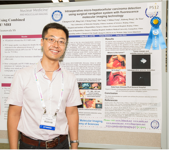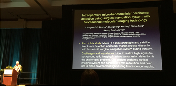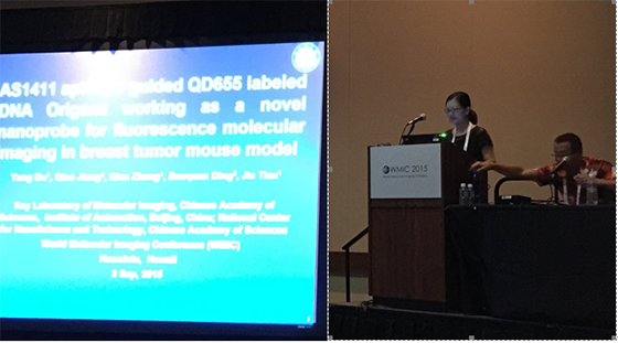 2015年9月2日至5日,世界分子影像大会(World Molecular Imaging Congress, WMIC)在美国檀香山国际会议中心举办。在此次大会的Scientific Session上,自动化所杜洋副研究员受邀做了关于DNA折叠结构新型纳米分子探针进行乳腺癌肿瘤靶向成像的口头报告,并获得了大会颁发的女性分子影像研究成果奖。自动化所迟崇巍助理研究员报告了自主研发的分子影像手术导航系统在肝癌手术方面的最新研究进展,国际同行专家们认真听取讲解并综合所有海报内容进行评比,最终我们的研究成果得到了评审团的一致好评,并被选为最佳海报奖(1st Place Poster Award)。同时临床转化的工作也受到了美国工程院院士、Vanderbilt大学脑影像科学研究院院长John Gore教授的关注。在大会闭幕式的亮点点评大会上,他将自动化所研发的分子影像手术导航系统及在肝癌手术过程中高灵敏度发现微小肿瘤病灶这一研究进展作为大会亮点(Highlight)进行报告,这也是所有被选为亮点的报告中唯一来自中国大陆的研究工作。