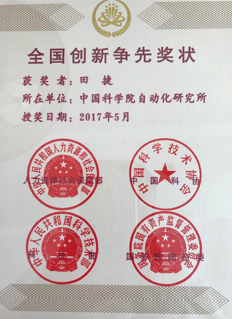 5月27日,庆祝全国科技工作者日暨创新争先奖励大会在北京隆重召开?;嵘媳碚昧耸捉?ldquo;全国创新争先奖”获奖团队和个人,获奖者包括近百位两院院士在内的各行业领军人才。自动化所田捷研究员获颁“全国创新争先奖”。