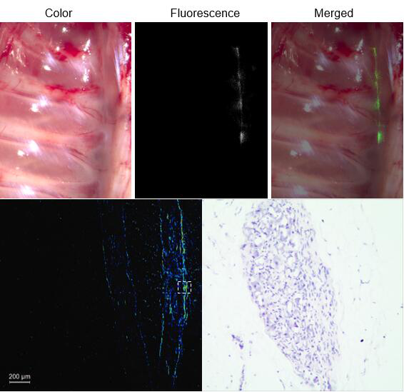 胸交感神经作为交感神经系统的重要组成部分,与多种疾病的诊疗相关,如高血压、心脏衰竭和帕金森综合征等。然而胸交感神经节在可见光下难以分辨,目前临床上依靠肋骨法进行定位。但多项研究表明,解剖结构变异常常引起胸交感神经节相对于肋骨位置的变化。无法准确的识别胸交感神经节可能会导致手术失败和严重的并发症。为解决这一难题,团队利用吲哚菁绿(ICG)开展了胸交感神经的预临床和临床研究。