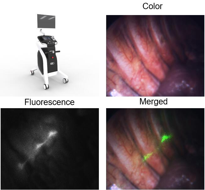 在临床研究中,共入组了15例肺结节患者,术前24小时于静脉注射5 mg/kg ICG。利用自主研发的近红外光与白光双通道系统进行了荧光导航的胸腔镜手术,术中所有患者的星状神经节(SG)到T6神经节,以及它们之间的神经链均可显影,信背比高达3.26(标准差为0.57)。